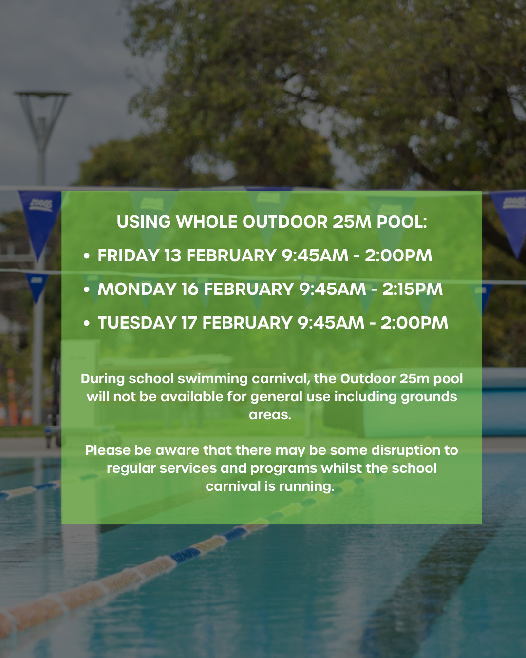 A reminder that during the school swimming carnivals there may be some disruption to regular services and programs whilst they are running. Please check our lap lane availability and plan your visit accordingly. Thank you for understanding ![]()